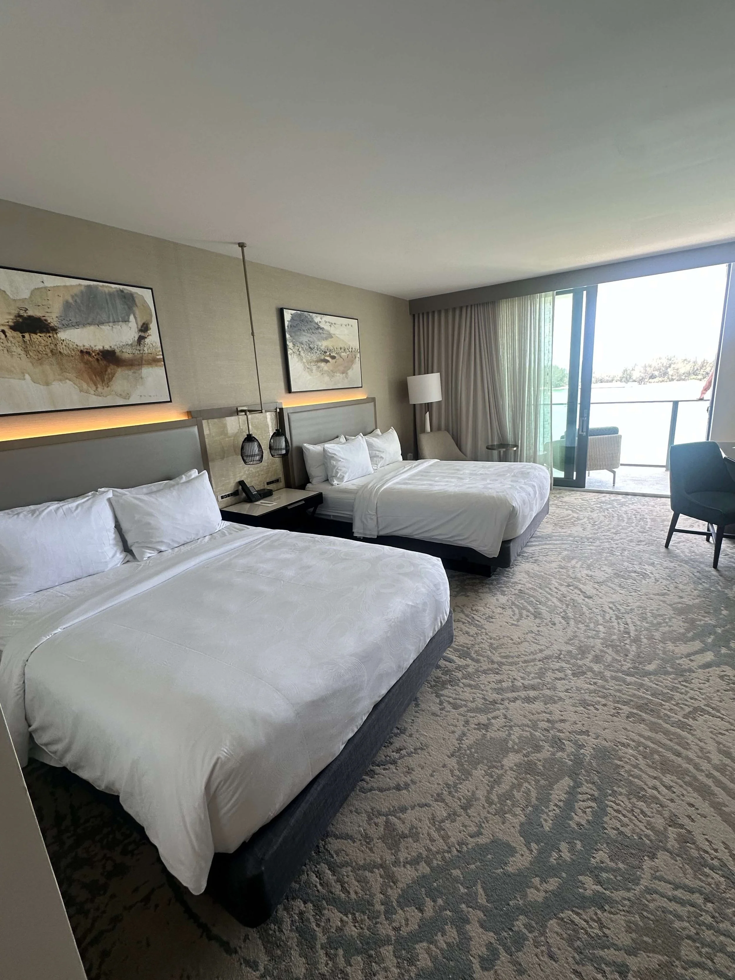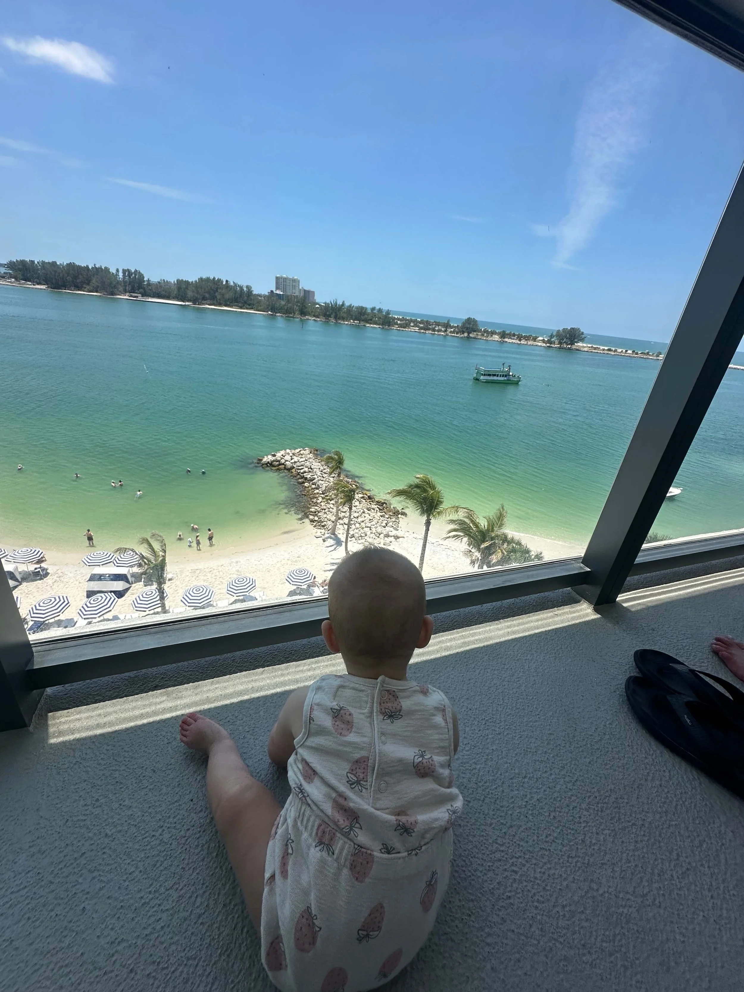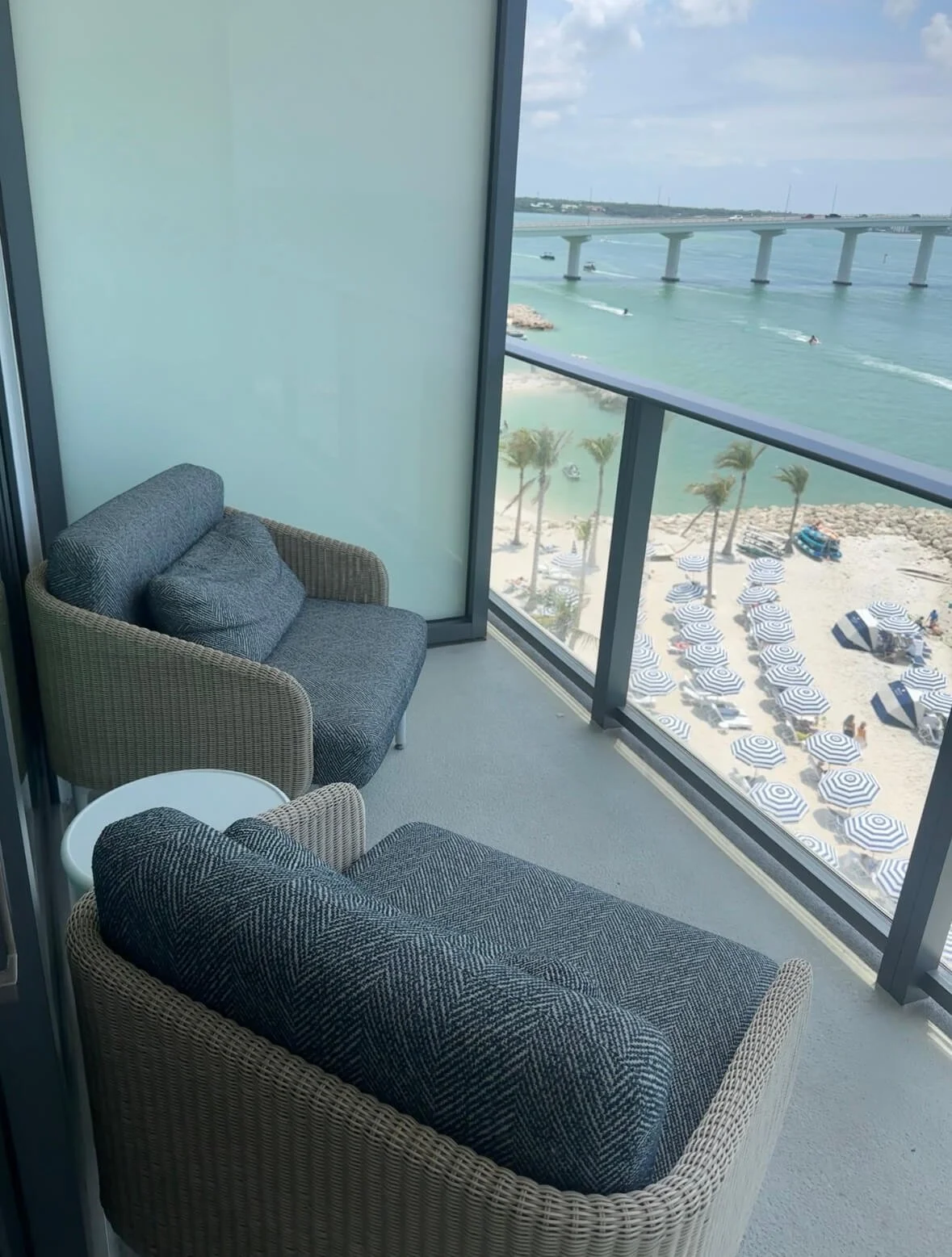 The room itself was spacious and clean, with two comfy queen beds, crisp linens, and plenty of space for our Pack and Play. The beach view from the balcony made the whole stay—two cushioned chairs and a little table where we sipped wine during nap time while watching dolphins and even a manatee cruise by.