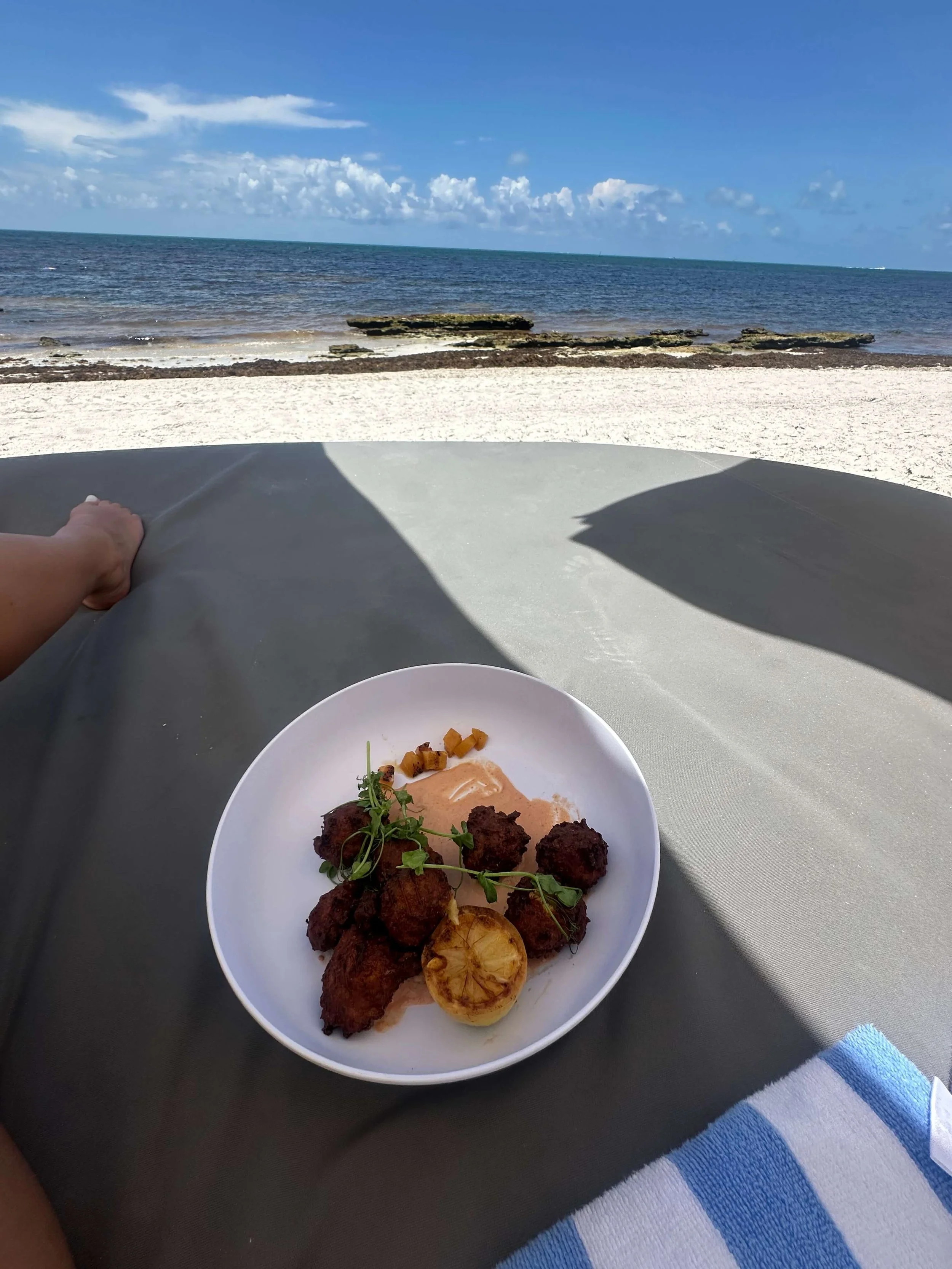 Conch fritters delivered to your beachfront daybed… just steps from your oceanfront lanai.
